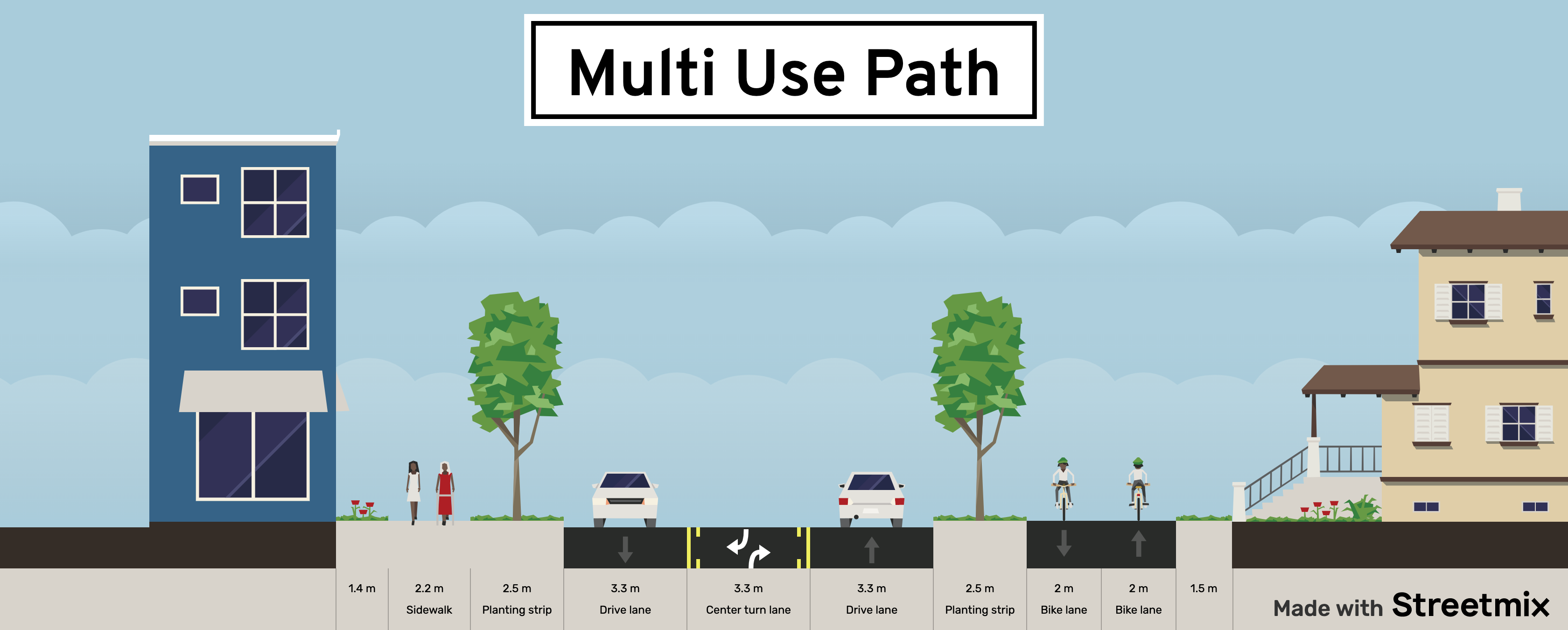Multi-use path: Two-way shared pedestrian and cycling facility, physically separated from motor vehicle traffic, often located similarly to a sidewalk, but larger to accommodate both pedestrians and cyclists.
