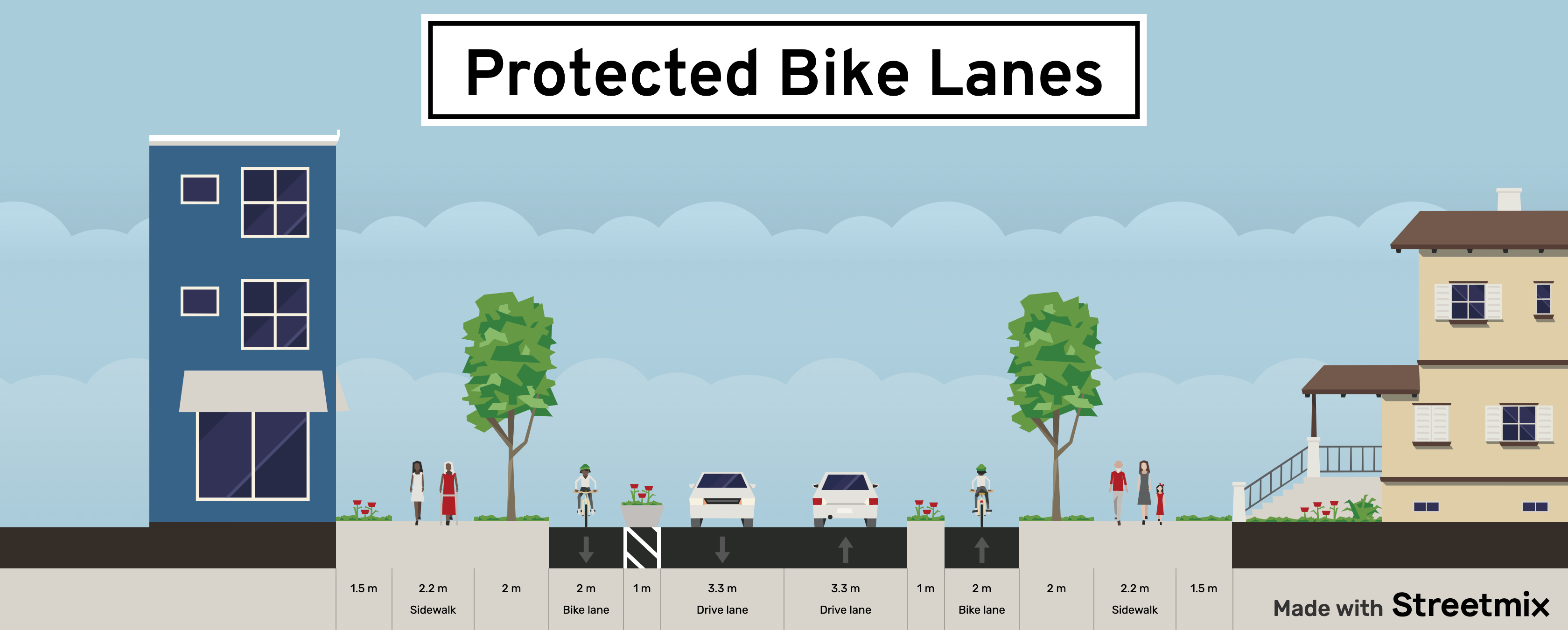 Protected bike lane: One-way, on the same level as the roadway, with physical separation between people riding bikes and motor vehicle traffic with materials such as curbs, bollards, or planter boxes.
